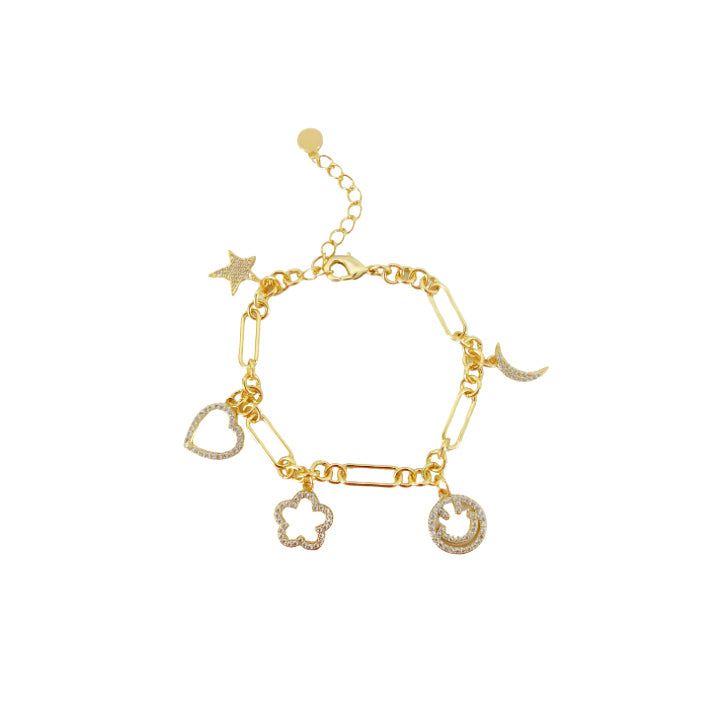 A refined take on everyday charm jewelry. The Charm Edit Bracelet features a curated mix of pavé-detailed charms suspended from a structured gold-tone link chain, designed to feel modern, intentional, and effortlessly elegant.