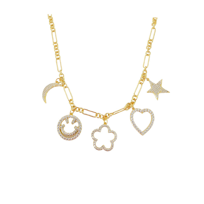 A refined expression of modern charm jewelry. The Charm Edit Necklace features a curated selection of pavé-detailed charms - Star, moon, heart, flower, and smiley- set along a structured gold-tone link chain.