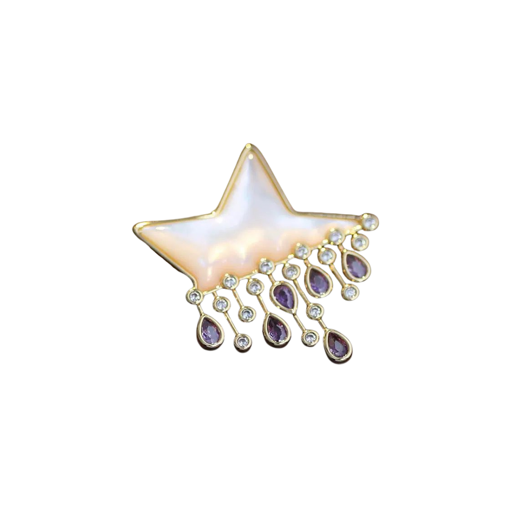 Starfall Luxe Brooch features an iridescent opaline star framed in gold, finished with a delicate cascade of shimmering drops that move softly with every step.