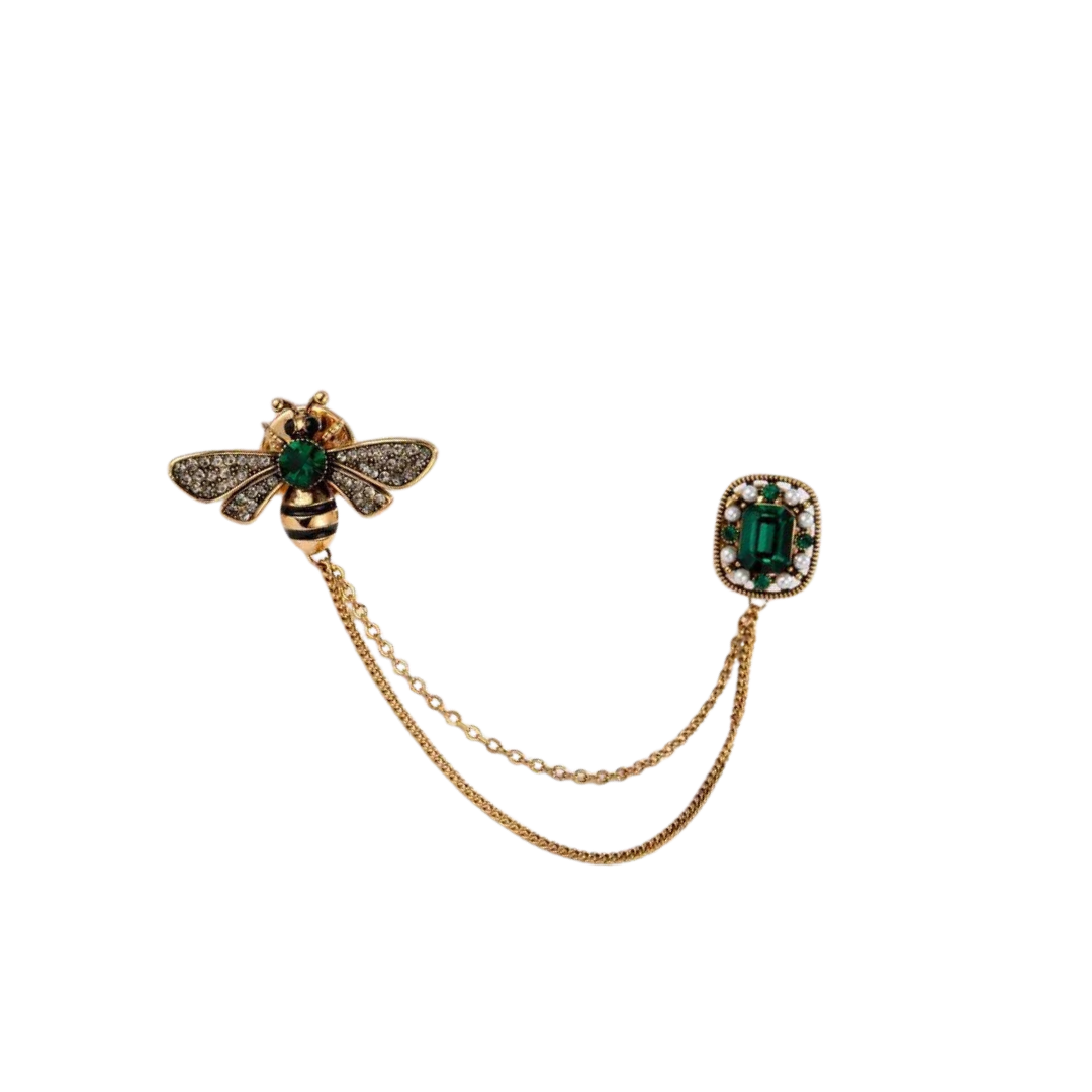 Emerald Bee Brooch features a delicately detailed bee design accented with an emerald-toned centerpiece, pavé wings, and a graceful double-chain drape that adds movement and sophistication.